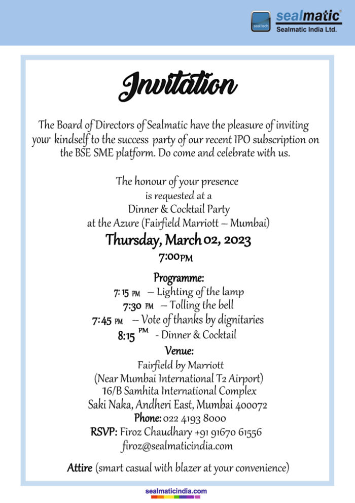 The Board of Directors of Sealmatic have the pleasure of inviting your kindself to the success arty of our recent IPO subscription on the BSE SME platform. Do come and celebrate with us.