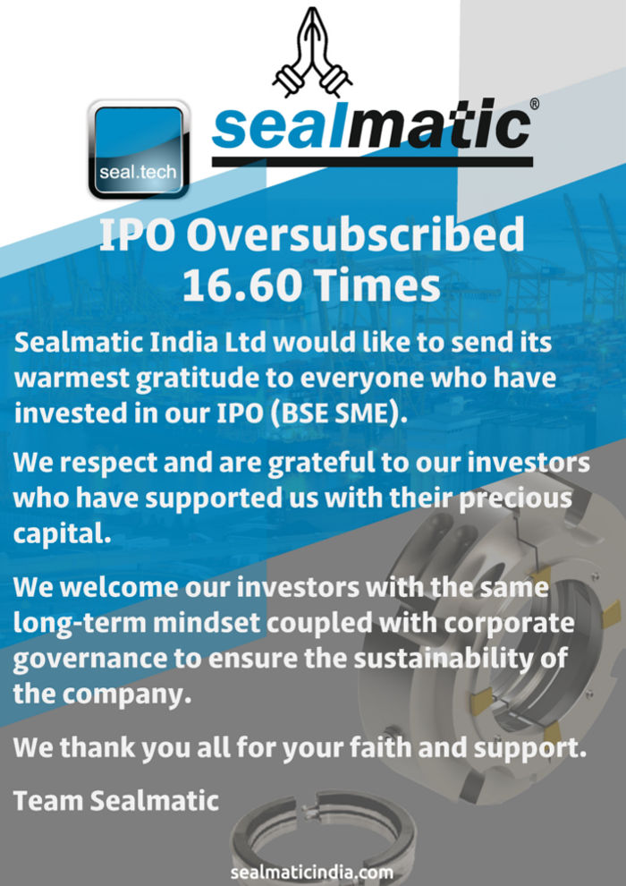 Sealmatic India Ltd. would like to send its warmest gratitude to everyone who have invested in our IPO (BSE SME).